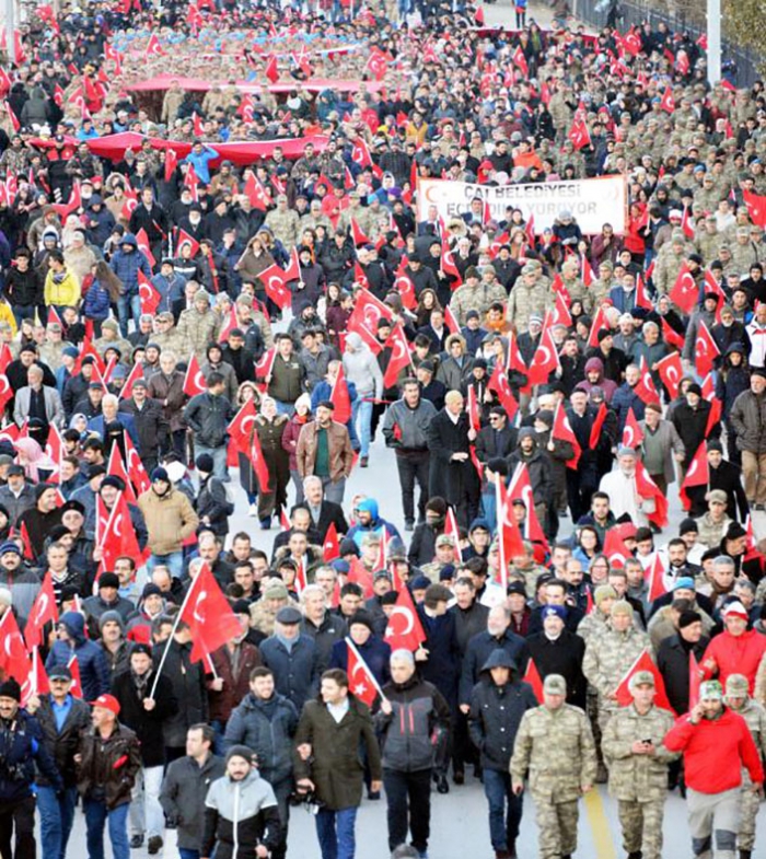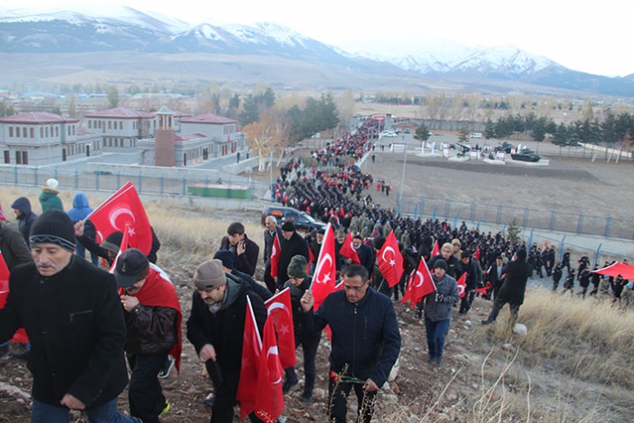 Erzurum'daki tüm camilerde okunan 'Sala' ardından cami önlerinde ve farklı güzergahlarda toplanan halk, Büyükşehir Belediyesi tarafından hazır bekletilen otobüslerle Karskapı Şehitliği'ne taşındı. 9 pare top atışı ardından şehitlik önünde ellerinde Türk bayrakları ile toplananlar 'Tekbir' getirerek yürüyüşe başladı. Kadın- erkekli binlerce kişi, Nene Hatun'un destanlaştığı ve mezarının bulunduğu deniz seviyesinden 2 bin metre yükseklikteki Aziziye Tabyası'na akın etti. Tabyalarda toplanan kalabalık, İstiklal Marşı'nı söyledikten sonra okunan Kuran-ı Kerim'i dinledi. Müftü Hasan Hüsnü Sula tarafından yapılan duada etkinliğe katılanlar hep birlikte 'Amin' dedi. 109'uncu Topçu Alayı Ölçme ve Hedef Tespit Bölük Komutanlığı, bağladıkları Türk bayrağını meteotorolojik balonlarlar göklere çıkardı.