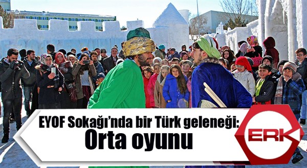 Avrupa Gençlik Olimpik Kış Festivali (EYOF) kapsamında Atatürk Üniversitesi tarafından tanzim edilen Kültür ve Sanat Sokağı, ziyaretçilerine eğlenceli anlar yaşatıyor. Kar ve Buz heykellerinin yanı sıra konser ve çeşitli etkinliklerin yapıldığı sokakta misafirlerine bu sefer, kadim bir Türk geleneği olan Orta Oyunu sergilendi. Erzurum’da eğitim gören birçok öğrencinin de izlediği oyunlar büyük beğeni topladı. Gönüllerince eğlenen çocuklar, gülmekten kendilerini alamadı. Hava sıcaklığının sıfırın altında 5 derecede olmasına rağmen yaklaşık 20 dakika Orta Oyunundan örnekler sunan Güzel Sanatlar Fakültesi Sahne Sanatları Bölümü öğrencileri, izleyicilerin alkışları ile ısındı.
