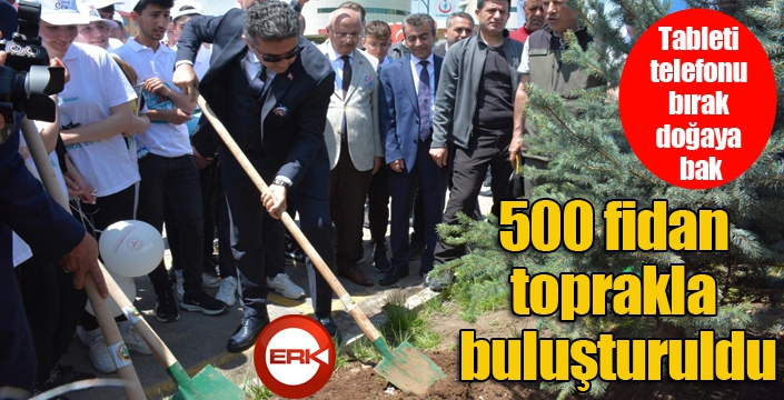 ERKHABER / ERZURUM - Erzurum'da iklim değişikliği ile mücadele çerçevesinde düzenlenen ‘Tableti, telefonu bırak doğaya bak’ temalı etkinlikte 500 fidan toprakla buluşturuldu.