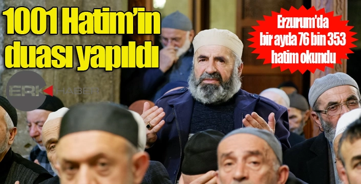 Erzurum merkez ve ilçelerindeki camilerde 13 Aralık 2024'te başlayan 1001 Hatim'in duası bugün cuma namazı öncesi Ulu Camii'nde gerçekleştirildi. 13 Aralık'ta başlayan program kapsamında okunan 76 bin 353 hatmin duası; Erzurum Valisi Mustafa Çiftçi, eski Çevre ve Şehircilik Bakanı İdris Güllüce, AK Parti Erzurum Milletvekili Selami Altınok, Büyükşehir Belediye Başkanı Mehmet Sekmen, Diyanet İşleri Başkan Yardımcısı Doç. Dr. Burhan İşleyen, Diyanet İşleri Başkanlığı Mushafları İnceleme ve Kıraat Kurulu Başkanı Dr. Osman Şahin, ilçe kaymakam ve belediye başkanları, Erzurum İl Müftüsü Dr. Rüstem Can, Trabzon Müftüsü Selami Aydın, Gümüşhane Müftüsü Hüseyin Gün, Erzincan Müftüsü İsmail Fakirullahoğlu, Kars Müftüsü Yavuz Yıldız, Ayasofya Camii İmam Hatibi Bünyamin Topçuoğlu, Hafız Mustafa Kızılcaoğlu, İstoç Camii İmam Hatibi Sefa Taşkesenlioğlu, AK Parti İl Başkanı İbrahim Küçükoğlu, MHP İl Başkanı Adem Yurdagül, ilçe müftüleri ve vatandaşların katılımı ile yapıldı.