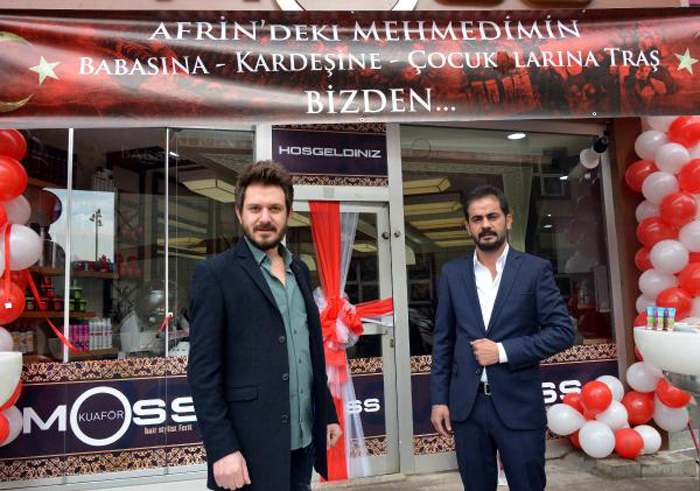 Merkez Yakutiye ilçesindeki erkek kuaföründe örnek bir kampanyaya imza atıldı. İş yerine astıkları, 'Afrin'deki Mehmedim'in babasına, kardeşine, çocuklarına tıraş bizden' pankartı ile bunu duyuran Gürbüz ve Teper herkesi imkânı ölçüsünde destek olmaya çağırdı. Vatanı ve milleti için canını hiçe sayan Mehmetçik'le gurur duyduklarını ve onların geride bıraktıklarına bakmak zorunda olduklarını vurgulayan Tolga Gürbüz, "Askerlerimiz bizim için canını hiçe sayıyor. Onlara borcumuz var. Gelen şehit haberleri bizi çok etkiliyor. Arkadaşım Ferit Teper ile erkek kuaför dükkânı açtık. Açarken de böyle bir kampanya başlattık. Bu kampanyayı duyan lütfen duyuru yapsın. Afrin'de evladı, kardeşi ve oğlu olan varsa gelirse memnun oluruz. Biz Mehmetçiğe borcumuzu parayla ödeyemeyiz" diye konuştu.