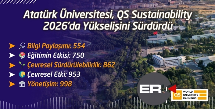 ERKHABER / ERZURUM - Atatürk Üniversitesi; çevresel, yönetişimsel ve toplumsal sürdürülebilirlik performanslarını değerlendiren QS Sustainability 2026 sonuçlarında dikkat çeken bir yükseliş kaydederek uluslararası alanda konumunu güçlendirdi. Bu doğrultuda ilk kez 2025 yılında QS (Quacquarelli Symonds) sıralamasına giren Atatürk Üniversitesi, 2026 sıralamasında da önemli bir başarı gösterdi.