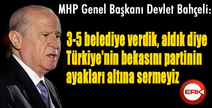 MHP Genel Başkanı Devlet Bahçeli: "Cumhur ittifakı önemli ve hayırlı bir ittifaktır. Yenikapı ruhunun devamıdır.3-5 belediye verdik, aldık diye Türkiye'nin bekasını partinin ayakları altına sermeyiz. Bu ittifak Yenikapı ruhunun devamıdır. Seçimlerin yönetim sistemine etkisi iyi okunmalı. 30 büyükşehirde prensip anlaşması sağlandı. Cumhur ittifakı yüzde 52’nin altına düşmemeli. 2 büyükşehirde yüzde 52’nin altına düşmemek için aday çıkarmadık. AK Parti’nin getireceği tabloyla devam ederiz. ”