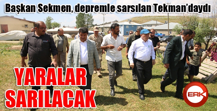 ERKHABER / ERZURUM - Geçtiğimiz gün 4.3 şiddetinde depremle sarsılan Tekman'da bazı evlerde hasar meydana gelmişti. Depremin hemen ardından ekibiyle birlikte Tekman'a çıkarma yapan Erzurum Büyükşehir Belediye Başkanı Mehmet Sekmen, vatandaşlarla bir araya gelip, hasar oluşan evlerde incelemelerde bulundu. Depremden etkilenen Dalsöğüt, Alabayır, Karlıca ve Yiğitler Mahallelerine giden Sekmen, hasar gören mahallelerde dönüşümün en kısa sürede gerçekleştirileceğini söyledi. Devletin dün olduğu gibi bugün de vatandaşının yanında olduğunu ifade eden Başkan Sekmen, ''Göreve geldiğimiz günden buyana Erzurum'da kentsel dönüşümde adeta rekor kırdık. Şehri neredeyse yeniden inşaa ediyoruz. Tekman da değişip dönüşecek. Hasar tespitlerini tamamlayıp, Yaraları en kısa sürede saracağız''dedi.