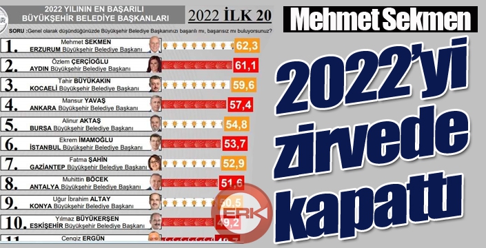 Sonar Araştırmanın yaptığı 2022 yılının en başarılı Büyükşehir Belediye Başkanları Listesinde yer alan Mehmet Sekmen'i Aydın Büyükşehir Belediye Başkanı Özlem Çerçi ile Kocaeli Belediye Başkanı Tahir Büyükakın izledi.