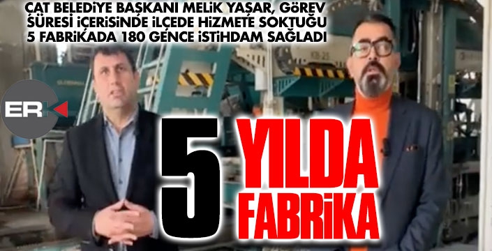 Bugünkü değeri 300 milyon lirayı bulan fabrikalarda şuan Çatlı 200'e yakın genç istihdam ediliyor. Ayrıca, Beton Santrali, Bims Fabrikası, Mobilya Atolyesi, Kilittaşı fabrikası sayesinde, ilçeye yapılan hizmetlerin maliyeti neredeyse yarı yarıya azalıyor. Gazeteci Sinan Özçaylak, Çat Sanayi Sitesi'ni Başkan Melik Yaşar'la birlikte gezdi.