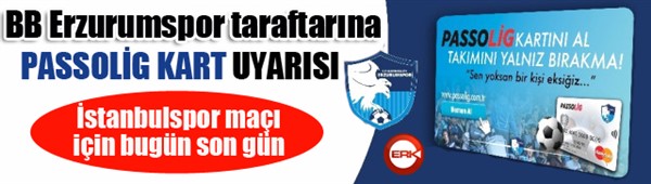 ERKHABER / ERZURUM - Cuma günü Kazım Karabekir Stadyumu’nda oynanacak olan BB Erzurumspor- İstanbulspor maçı öncesi mavi-beyazlı taraftarlara Passolig Kart uyarısı geldi. Maçı stadyumda izlemek isteyen taraftarlar Perşembe Günü Passolig kart alabilecek. Cuma günü kart dağıtımı yapılmayacak.