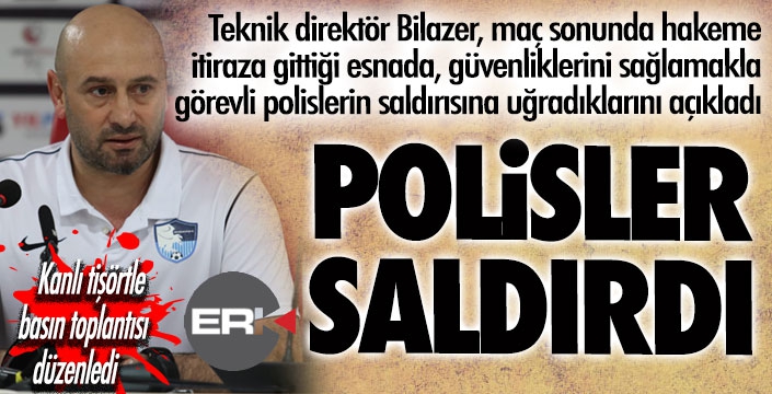 ERKHABER / ERZURUM - Erzurumspor FK teknik direktörü Muzaffer Bilazer, Samsunspor'a 2-1 mağlup oldukları maçın ardından düzenlenen basın toplantısında, güvenliklerini sağlamakla görevli olan polislerin saldırısına uğradıklarını açıkladı. Maçın sonunda soyunma odası koridorund hakeme itiraz ederken, anlamsız bir şekilde polislerin kalkanlarla kendilerine saldırdığını ve aldıkları darbeler sonucunda yaralandıklarını ifade etti ve üzerine kan bulaşan tişörtüyle açıklamalarda bulundu.
