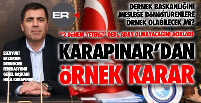 ERKHABER / ERZURUM - Esenyurt Erzurum Dernekleri Federasyonu (ESER-DEF) Genel Başkanı Halil Karapınar, tüm Sivil Toplum Kuruluşları’na (STK) örnek olacak bir karara imza attı. İki dönemdir yürüttüğü başkanlık görevi için yeniden aday olmayacağını açıklayan Karapınar, “Bu tip görevlerde iki dönem bence yeterli. Fazlasına gerek yok. Bu makamları uzun yıllar işgal etmeyi doğru bulmuyorum” dedi.
