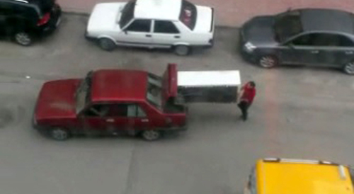 Erzurum kent merkezinde cep telefonu kamerasına büyük buzdolabını otomobilin bagajında taşıyan iki kişi yansıdı. Otomobil sürücüsü yavaş yavaş aracı kullanırken bir kişide bagajdaki buzdolabını düşmemesi için yaya halde tutarak yürüdüğü görüldü. Buzdolabının büyük bir kısmı bagajın dışında kalırken ilginç görüntüyü gören vatandaşlar şaşırdı.