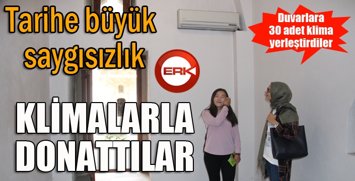 ERKHABER / ERZURUM - Aylardır süren restorasyon çalışmaları sonucunda, ziyarete açılan Çifte Minareli Medrese, yerli ve yabancı turistleri şoka uğrattı. Her bir odanın içerisine tarihi duvarlara monte edilmiş 30’a yakın klima, ziyaretçiler tarafından tepkiyle karşılandı.