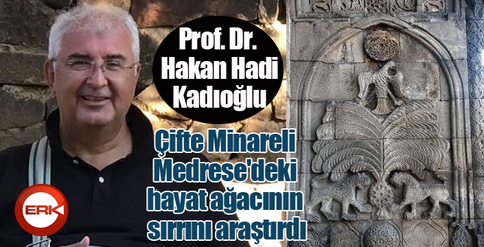 Prof. Dr. Hakan Kadıoğlu, Çifte Minareli Medresenin portalında çerçeve içerisindeki motifte bir kemer altında, adeta onu omuzlamış haldeki çift başlı karakuş hayat ağacının üzerinde durduğunu hatırlatarak, “Hayat ağacı yerden yükselmekte ay biçimli bir rozetten geçerek Gök'e yükselmektedir. Böri~kurt başlı, pullu gövdeli iki ejderha hayat ağacını sarmaktadır. Hayat ağacının daları hurma biçiminde resmedilmiş, dalları arasında nar biçimli meyveler ve küçük kuş figürleri görülmektedir. Çift başlı karakuş ya da kartalın Umay~Huma kuşunu temsil ettiği de düşünülmektedir. Hayat ağacının dalları göğün katmanlarını karşılamaktadır. Dalları arasında Hüma'nın yavruları ve kutsal meyveler bulunmaktadır. Karakuş Türklerde büyük ve yırtıcı kuşları tanımlar.” dedi.