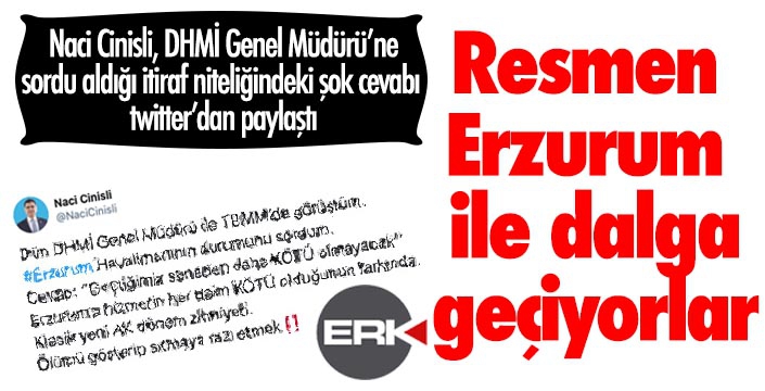 CAT 3 sisteminin kurulumundan sorumlu olan DHMİ Genel Müdürü Hüseyin Keskin'in Erzurum ile dalga geçer gibi verdiği cevabı değerlendiren Cinisli, "Cevap: ‘’Geçtiğimiz seneden daha KÖTÜ olmayacak’’ Erzurum’a hizmetin her daim KÖTÜ olduğunun farkında. Klasik yeni AK dönem zihniyeti. Ölümü gösterip sıtmaya razı etmek!!" yorumunu yaptı.