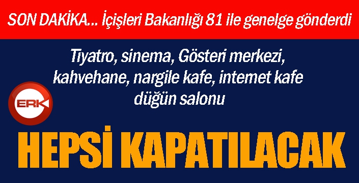 İçişleri Bakanlığı, 81 il valiliğine 'Korona Virüs' konulu ek bir genelge daha gönderdi. Genelge ile 81 ilde tiyatro, sinema, gösteri merkezi, konser salonu, nişan düğün salonu, çalgılı müzikli lokanta kafe, gazino, birahane, taverna, kahvehane, kıraathane, kafeterya, kır bahçesi, nargile salonu, nargile kafe, internet salonu, internet kafe, her türlü oyun salonları, her türlü kapalı çocuk oyun alanları (AVM ve lokanta içindekiler dahil), çay bahçesi, dernek lokalleri, lunapark, yüzme havuzu, hamam, sauna, kaplıca, masaj salonu, SPA ve spor merkezlerinin faaliyetleri geçici bir süreliğine 16 Mart saat 24.00 itibariyle durdurulacak.