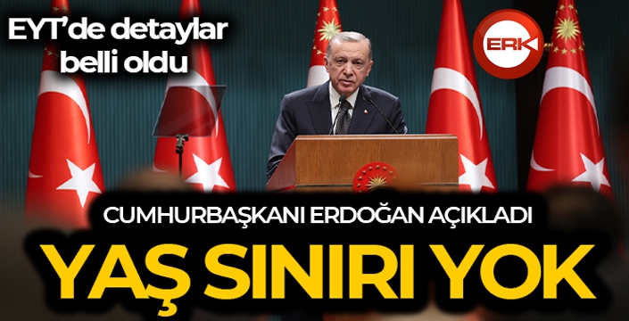 ERKHABER / ERZURUM - Cumhurbaşkanı Recep Tayyip Erdoğan, Cumhurbaşkanlığı Külliyesi'nde gerçekleştirdiği basın toplantısında emeklilikte yaşa takılanlar (EYT) ile ilgili düzenlemenin detaylarını açıkladı. Kamuoyunda EYT olarak bilinen bu düzenlemenin uzun ve kapsamlı bir çalışmanın ardından nihai halini aldığını kaydeden Cumhurbaşkanı Erdoğan, "Bilindiğini gibi ülkemizdeki sosyal güvenlik sisteminin sürdürebilir, makul ve adil, seviye getirilmesi hususunda önemli reformlara imza atmış bir hükümetiz" dedi.
