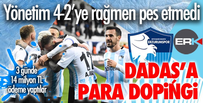 ERKHABER / ERZURUM - Büyükşehir Belediye Erzurumpor yönetimi, Pazar günü deplasmanda İstanbulspor ile oynayacağı Play Off yarı final rövanş maçı öncesinde futbolculara para dopingi yaptı. İlk maç öncesinde 8 Milyon TL dağıtan Ömer Düzgün başkanlığındaki yönetim, 4-2’lik yenilgiye rağmen bugün de 6 Milyon TL dağıttı ve oyunculara bugüne kadar olan tüm alacaklarını ödemiş oldu.