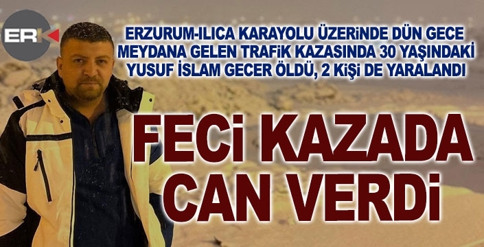 ERKHABER / ERZURUM - Erzurum-Ilıca karayolu üzerindeki Bölge İdare Mahkemesi kavşağında, dün gece saat 23.00 sıralarında aşırı hız ve dikkatsizlik meydana geldiği düşünülen trafik kazasında 25 AP 220 plakalı otomobil, canlı hayvan yüklü 25 AAV 503 plakalı kamyonete arkadan çarptı. Şiddetli çarpışmanın etkisiyle otomobil hurdaya dönerken, araçta bulunan Yusuf İslam Gezer ve E.T ile sürücü A.T. ağır yaralandı. Kamyonet sürücüsü de hafif yaralarla atlattığı kaza sonrasında olay yerine sevk edilen sağlık ekipleri tarafından hastaneye kaldırılan yaralılardan Oltu nüfusuna kayıtlı Yusuf İslam Gezer, doktorların tüm müdahalelerine rağmen hayatını kaybetti. Sürücü A.T.’nin ise hayati tehlikesinin devam ettiği öğrenildi.