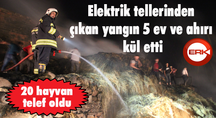 ERKHABER / ERZURUM - Erzurum’un Kırmızıtaş köyünde elektrik tellerinden çıkan yangın sonucunda 5 ev ve ahır kül olurken, 20 hayvan ise telef oldu.