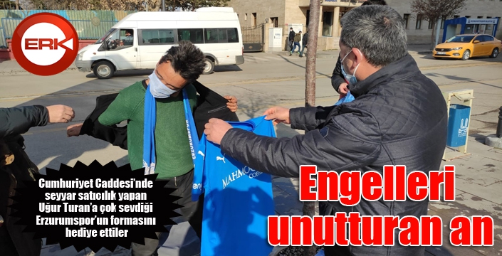 ERKHABER / ERZURUM - Erzurum Gençlik ve Spor İl Müdürlüğü Yakutiye Gençlik Merkezi, 3 Aralık Dünya Engelliler Günü münasebetiyle Cumhuriyet Caddesi’nde seyyar satıcılık yapan Uğur Turan’a çok sevdiği Erzurumspor’un formasını hediye ettiler. Genç taraftar, Mavi-beyazlı kulübün katkılarıyla hayatının en mutlu anını yaşadı.