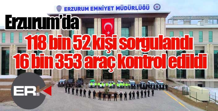 Polis bir ay içinde Erzurum’da toplam 118 bin 52 kişi şahıs üzerinde sorgulama yaptı, 16 bin 353 denetledi, 770 umuma açık iş yeri, 508 park bahçeler ve bin 874 metruk binada arama-kontrol yaptı. Bu çalışmalarda toplam; 304 bakaya, 259 aranan şahıs , 27 narkotik madde icrası ve 391 araç için cezai işlem yapıldı. Çalışmalarda 167 fişek, 10 tabanca, 9 kuru sıkı ve 9 av tüfeği ve 106 adet bıçak ele geçirildi. Polis yaptığı operasyonlarda narkotik madde de ele geçirdi.