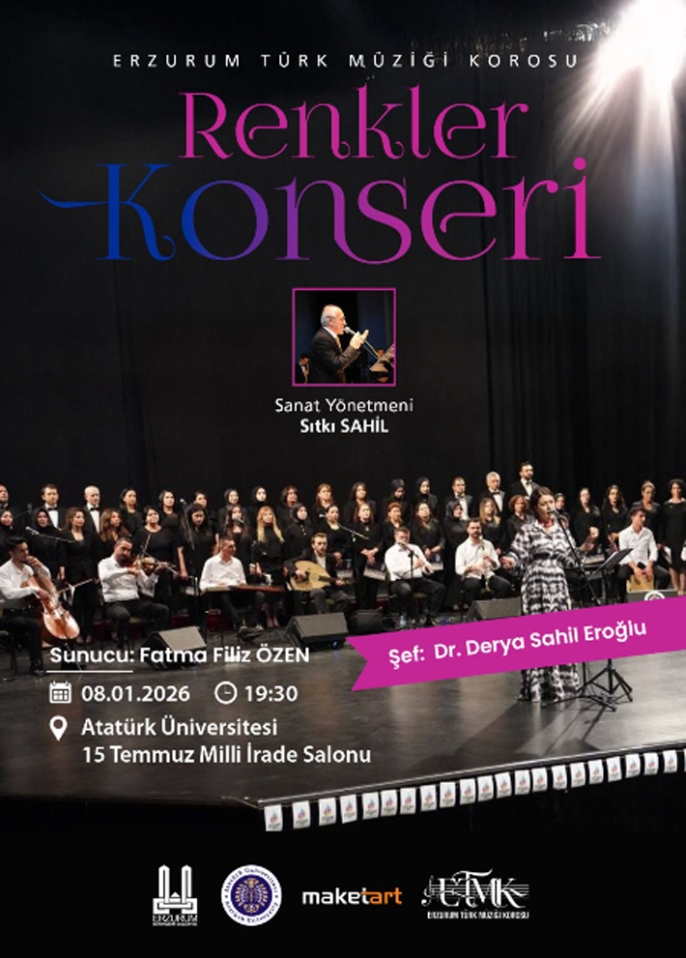 Erzurum’un sanata değer veren sivil toplum hareketlerinden biri olan Erzurum Türk Müziği Korosu, yeni yılın ilk büyük sanat etkinliğine imza atıyor. Atatürk Üniversitesi, Erzurum Büyükşehir Belediyesi Kültür Daire Başkanlığı ve MaketArt İnşaat’ın katkılarıyla düzenlenecek olan "Renkler Konseri", 8 Ocak 2026 Perşembe günü saat 19.30’da gerçekleşecek.