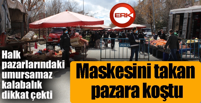 ERKHABER / ERZURUM - Korona virüs önlemleri kapsamında pazar alanlarına girişlerde maske takmanın zorunlu olmasının ardından Erzurum’da vatandaşlar maskelerini takıp pazar alanlarına koştu. Halk pazarlarındaki vatandaşlar ise polis ekipleri tarafından sosyal mesafe hususunda sık sık uyarıldı.