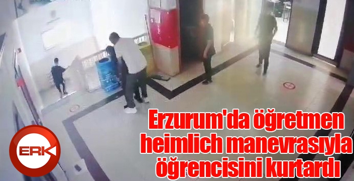 Erzurum Sabancı Ortaokulu Fen ve Teknoloji Öğretmeni olan Cem Bilal Kaya, nefes borusuna beslenme için evden getirdiği pasta kaçan öğrencisini heimlich manevrasıyla kurtardı, o anlar okulun güvenlik kamerasına anbean yansıdı.