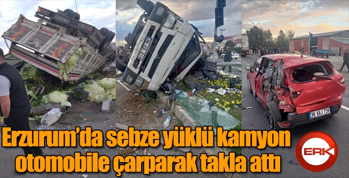 ERKHABER / ERZURUM - Erzurum’da sebze yüklü kamyon, otomobile çarptıktan sonra devrildi.