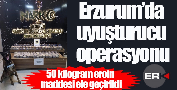 Erzurum Emniyet Müdürlüğü Narkotik Suçlarla Mücadele Şube Müdürlüğü ve İstihbarat Şube Müdürlüğü görevlilerimizce il genelinde uyuşturucu madde konularına yönelik Narkotik Madde Arama Köpeği Magnum ve Hera ile yapılan kontroller neticesinde; 51 kilogram 550 gram eroin maddesi ele geçirildi.