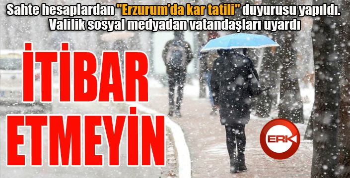 ERKHABER / ERZURUM - Erzurum'da etkili olan kar yağışıyla birlikte Erzurum Valiliği adına açılan sahte hesaplardan 27 Şubat Çarşamsa günü okulların tatil edildiği duyuruldu. Erzurum Valiliği ise vatandaşları sosyal medya üzerinden yapılan bu paylaşımlara itibar etmemesi konusunda uyarılarda bulundu.