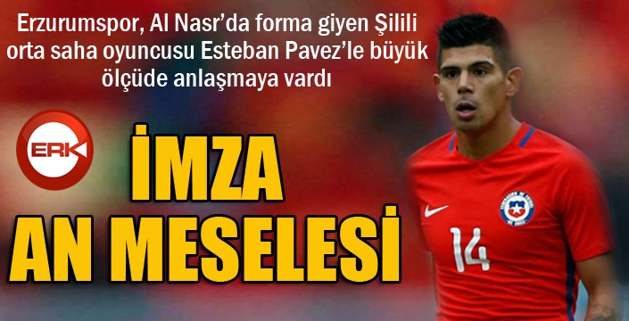 Transfer çalışmalarının sürdüğü Büyükşehir Belediye Erzurumspor, rotasını Şili'ye çevirdi. Süper Lig'de güçlü bir kadro kurmak için transfer de ince eleyip sık dokuyan mavi-beyazlılar, Al Nasr'da forma giyen Şilili yıldız Esteban Pavez'le büyük ölçüde anlaşmaya vardı. Pavez'in bugün kendisini mavi-beyazlı renklere bağlayacak sözleşmeye imza atması bekleniyor.