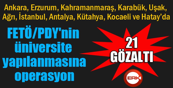 Ankara Cumhuriyet Başsavcılığı’nın yürüttüğü FETÖ/PDY silahlı terör örgütü üniversite yapılanmasına yönelik yürütülen soruşturma kapsamında haklarında ifade ve fotoğraf teşhisi bulunan 21 kişi hakkında gözaltı kararı verilmişti. Ankara, Erzurum, Kahramanmaraş, Karabük, Uşak, Ağrı, İstanbul, Antalya, Kütahya, Kocaeli ve Hatay’da yapılan operasyonlarda 10 kişi yakalanarak gözaltına alındı. 11 zanlının ise yakalanması için çalışmaların sürdüğü bilgisi paylaşıldı. Şüphelilere ilişkin işlemlerin Ankara Emniyet Müdürlüğü Terörle Mücadele Şube Müdürlüğü tarafından yürütüldüğü aktarıldı.