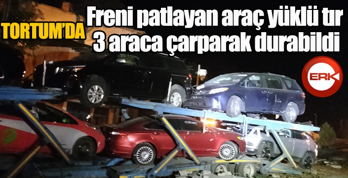 ERKHABER / ERZURUM - Edinilen bilgilere göre kaza, Tortum'da dün akşam saatlerinde gerçekleşti. Araç yüklü olan tır, freni patlaması sonucu 3 araca çarparak durabildi. Kaza sonucu yaralılar olduğu bildirilirken, tırda bulunan araçlar ise yola savruldu. Olay yerine gelen polis ekipleri ise kaza ile ilgili soruşturma başlattı.