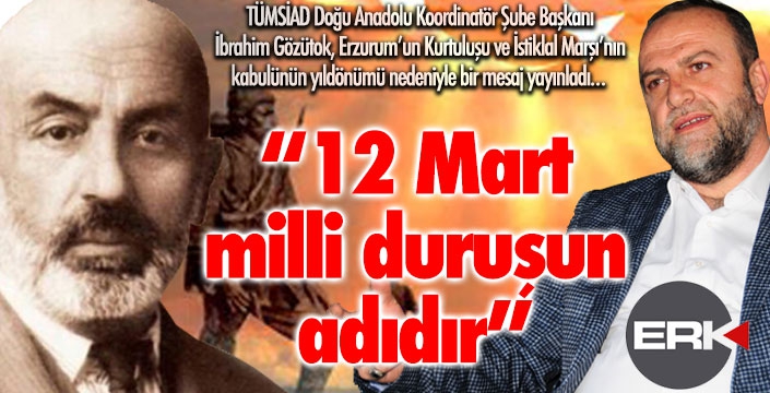 ERKHABER / ERZURUM - Tüm Sanayici ve İş Adamları Derneği (TÜMSİAD) Doğu Anadolu Koordinatör Şube Başkanı İbrahim Gözütok, 12 Mart Erzurum’un kurtuluşunun 103’ncü ile İstiklal Marşı’nın Kabulü ve Mehmet Akif Ersoy'u Anma Günü dolayısıyla birer mesaj yayınladı. TÜMSİAD Doğu Anadolu Koordinatör Şube Başkanı Gözütok, “12 Mart, milli bir duruş ev aynı zamanda mücadele azmine gösterilebilecek en güzel örneklerden birisidir” dedi.