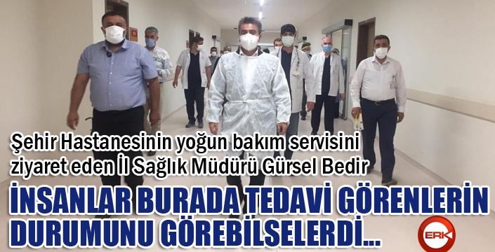 Yoğun bakım servisi sağlık görevlilerini ve hastaları ziyarette bulunan Erzurum İl Sağlık Müdürü Gürsel Bedir, “Şuanda yoğun bakım servisinin ön alanındayım. İçeride her bir odada bir nefes sıhhat için mücadele eden insanlar var. 30 yaşında olanda var, 80 yaşında olanda. Eğer onların durumlarını görebilseydi insanlar, nefes aldıkları her bir an için şükrederlerdi. Ben öyle yapıyorum” dedi.