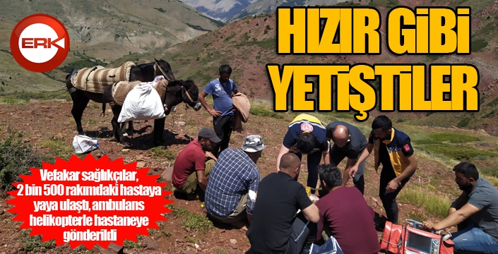 ERKHABER / ERZURUM - Bingöl’de rahatsızlanan 62 yaşındaki hasta için 2 bin 500 rakımlı Bilice yaylasına sağlıkçıların malzemeleri at ve eşek sırtında kendileri ise yaya ulaştı. İlk müdahalesi yapılan hasta bölgeye sevk edilen helikopterle Erzurum Şehir Hastanesi’ne kaldırıldı.