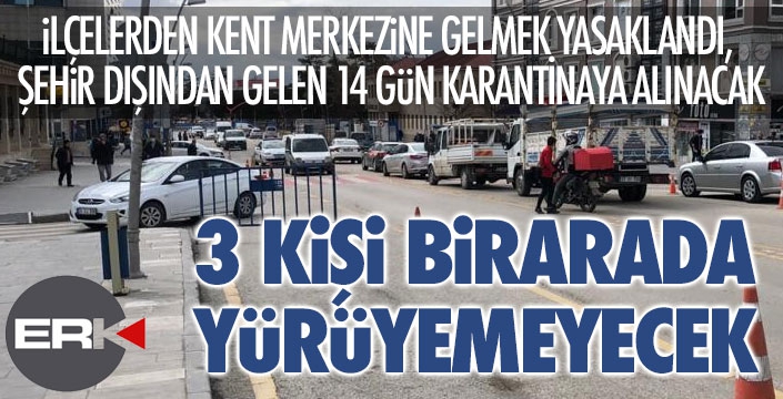 ERKHABER / ERZURUM - Erzurum Valisi Okay Memiş başkanlığında toplanan İl Hıfzıssıhha Kurulu, korona virüs tedbirleri kapsamında yeni bir dizi karar aldı. Buna göre, artık 3 veya daha fazla kişi yanyana yürüyemeyecek, ilçelerden kent merkezine seyahat kaymakamlık izni olacak. Şehir dışından Erzurum'a gelen ise 14 gün evlerinden çıkamayacak...