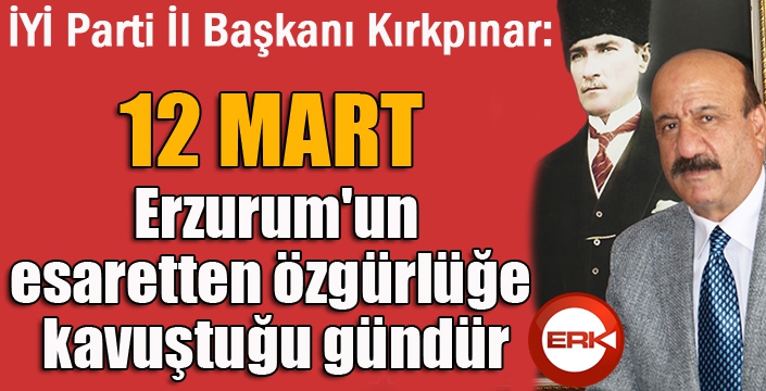 12 Mart'ın Erzurum'un esaretten özgürlüğe kavuştuğu gün olduğuna dikkat çeken İYİ Parti İl Başkanı Melih Kırkpınar, şunları söyledi; ''12 Mart yalnız Erzurumlular için değil,insanlık için de oldukça önemli bir gündür.Çünkü akla gelebilecek insanlık dışı her türlü işkence ve katliamı gerçekleştiren Ermeniler,bu toprakların vatan olması için canlarını ortaya koyan kahraman Anadolu insanının sayesinde geldikleri yere gönderilmiştir.