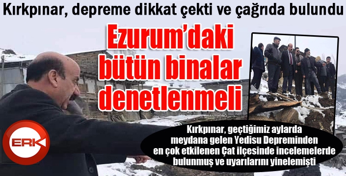 ERKHABER / ERZURUM - İzmir Depremi’nin bir kez daha Türkiye’deki konut stokunun halini gözler önüne serdiğini belirten, İYİ Parti Erzurum İl Başkanı Melih Kırkpınar, “ Erzurum’da fay hattı üzerinde. Devlet bir an önce Erzurum, merkez ve ilçelerindeki konutları denetleyerek, tedbir almalı.” dedi.