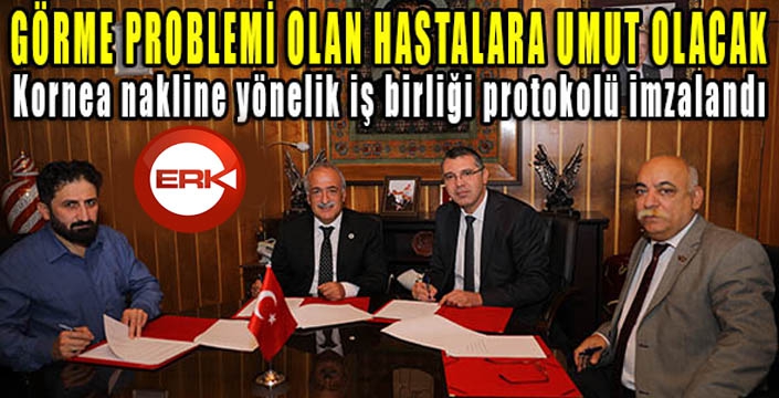 ERKHABER / ERZURUM - Atatürk Üniversitesi Tıp Fakültesi Göz Bankası ve Erzurum Adli Tıp Grup Başkanlığı arasında yapılması planlanan ortak çalışmalara yönelik imzalanan protokol törenine Atatürk Üniversitesi adına Rektör Prof. Dr. Ömer Çomaklı ile Tıp Fakültesi Adli Tıp Anabilim Dalı Öğretim Üyesi Prof. Dr. Ahmet Nezih Kök ve Göz Hastalıkları Anabilim Dalı Öğretim Üyesi Doç. Dr. Sadullah Keleş katılırken Erzurum Cumhuriyet Başsavcılığı adına ise Erzurum Cumhuriyet Başsavcısı Burhan Bölükbaşı katıldı.