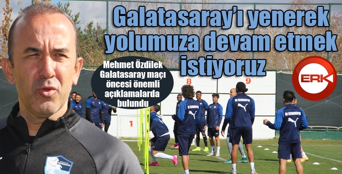 ERKHABER / ERZURUM - BB Erzurumspor Teknik Direktörü Mehmet Özdilek, Galatasaray’ı yenerek yola devam etmek istediklerini belirterek, “Galatasaray son zamanlarda sıkıntılı bir süreçten geçiyor. Dolayısıyla biz de bu hafta bıraktığımız yerden devam etmek istiyoruz. Amacımız kazanarak yolumuza devam etmek” dedi.
