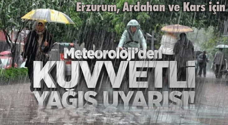 Meteoroloji Genel Müdürlüğü'nden yapılan açıklamada, "Yarın Doğu Anadolu'nun kuzeydoğusunda beklenen sağanak ve gök gürültülü sağanak yağışların Kars, Ardahan ve Erzurum çevrelerinde kuvvetli (21-50 Kg/m2) olacağı tahmin edildiğinden meydana gelebilecek ani sel, su baskını, yıldırım ve dolu riski ile yağış anında kuvvetli rüzgar gibi olumsuzluklara karşı dikkatli ve tedbirli olunması gerekmektedir" denildi.