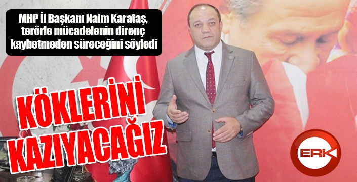 PKK terörüyle bu ülkede son 30 yıldır mücadele edildiğini ve eli kanlı örgütün artık son demlerini yaşadığını kaydeden MHP Erzurum İl Başkanı Naim Karataş, “Geçmişte bu terör belasıyla nasıl mücadele edildiğini hepimiz biliyoruz. Örgüte yol verenleri, büyütüp besleyenleri, göz yumanları ve semirtenleri de biliyoruz. Ama o dönemler artık çok geride kaldı. Şimdi devletimizin ve Türk Silahlı Kuvvetlerimizin demir yumruğu var. Her türlü terörü ve teröristleri eze eze kökünü kazımaya devam edeceğiz. En son terörist kalıncaya kadar da bu mücadelemize devam edeceğiz. Bu ülkenin ve bu milletin birliğine, dirliğine, berberliğine, milli bekası ve bütünlüğüne göz diken ya da bu yönde niyetler taşıyan, adım atan kim varsa, bilsinler ki yaptıkları yanlarına kalmaz, kalmayacak. Hepsinden ayrı ayrı hesap sorduk, sormaya da devam edeceğiz” diye konuştu.