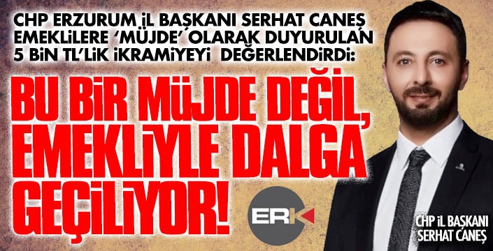 ERKHABER / ERZURUM - Enflasyonun altında ezilen emekliye hakkı olanın verilmediğini belirten CHP Erzurum İl Başkanı Serhat Can Eş, “ Emekli hakkı olanı istiyor, sadaka istemiyor, dilenmiyor, yıllarca verdiği emeğin karşılığını istiyor. Adeta Emekliyi yalvartarak müjde diye duyurulan bir sefere mahsus 5 bin TL ikramiye ödemesinin müjde diye duyurulmasını kınıyorum.” dedi.