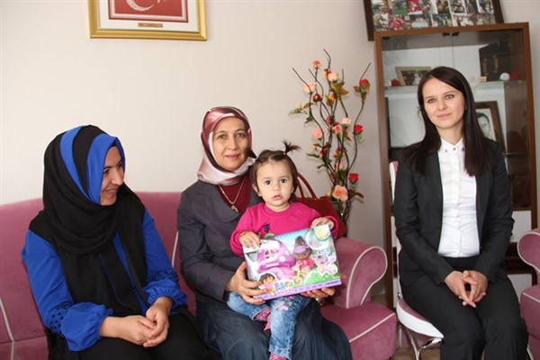Ziyaret ettiği şehit eşi Asiye Yeşilay ve annesiyle birlikte bir süre sohbet eden Nilgün Azizoğlu, şehidin emaneti minik Miray’ı kucağına alarak oyuncak hediye etti.