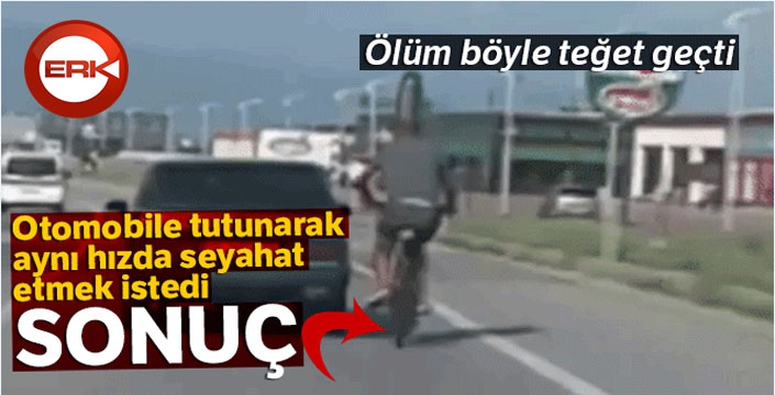 ERKHABER / ERZURUM - Yürekleri ağızlara getiren görüntü Bursa - İstanbul Kara yolunda çekildi. Önündeki araca tutunup seyahat etmek isteyen bir bisiklet sürücüsü, arkasında seyreden otomobildeki bir vatandaş tarafından cep telefonu ile kaydedildi. Bir süre otomobile tutunarak gitmeyi başaran bisiklet sürücüsü, dengesini kaybedince kendisini bir anda yerde buldu. Arkadan gelen otomobillerin altında kalmaktan son anda kurtulan bisikletli diğer sürücülere de isyan ettirdi.
