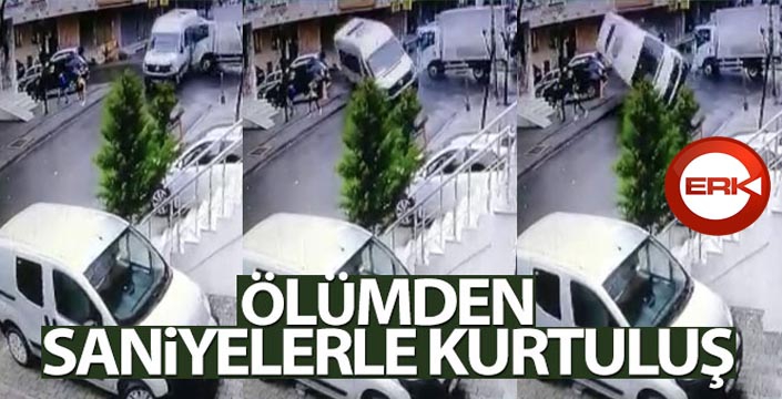 Görüntülerde 2 genç sokak üzerinde yürüyor. Gençler karşı sokağın kaldırımına geldiği esnada sokak üzerinden servis minibüsü geliyor. Diğer sokaktan çıkan kapalı kasa kamyonet ise keşişim noktasında minibüse çarpıyor. Kontrolden çıkan minibüs devriliyor. Kaldırımdaki 2 genç ise saniyelerle minibüsün altında kalmaktan kurtuluyor. Yan yatan minibüsün sürücüsünü kurtarmak için vatandaşlar koşuyor.