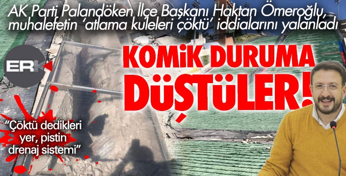 “Muhalefet her zaman olduğu gibi yalan üzerine siyaset yapıyor. Ancak komik duruma düşüyorlar" diyen Haktan Ömeroğlu, "Sadece Atlama Kuleleri değil, Erzurum’daki neredeyse bütün tesislerin onarımı için bundan aylar önce gençlik ve spor bakanlığa ile İl Başkanımız, Milletvekillerimiz görüşüp, gerekli bütçeleri çıkarmıştık. O göçük oldu denilen yer, atlama kulelerinin drenaj sistemi. Orada da bir sıkıntı var mı diye, Gençlik Spor İl Müdürlüğünden arkadaşlarımız inceleme yapmak için halıyı kaldırmışlar. Bunu gören muhalefet art niyetten olsa gerek, atlama kuleleri göçtü diye açıklamalar yapıyorlar. Gerçekten yazık çok yazık.” dedi.