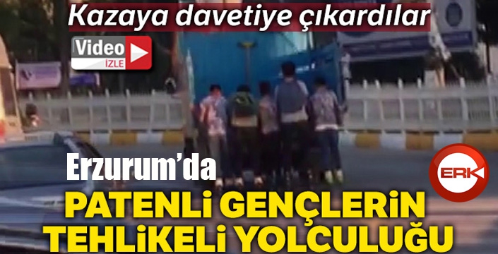 ERKHABER / ERZURUM - Araçların arkasına tutunarak kazaya davetiye çıkaran gençlere sürücüler de tepki gösteriyor. Üniversite Kavşağı'nda trafiğin yoğun olduğu saatlerde trafikte seyreden bir kamyonete sağlı sollu tutunarak kayan patenli 5 gencin kazaya adeta davetiye çıkardığı görüldü. Gençler, hareket halindeki otomobile tutunarak dakikalarca patenle ilerledi. Gençlerin tehlikeli yolculuğu, otomobilin bir süre sonra yön değiştirmesiyle sona erdi.