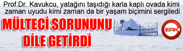 Daha önce şiddete yönelik yaptığı performanslarla tanınan Prof.Dr. Kavukçu, bu kez mülteci sorununu dile getirdi. Demirden yaptırdığı karyolayı fakültenin arkasındakı karla kaplı ovaya taşıyan Kavukcu, üzerine serdiği döşek ve yorganın içerisine girerek tepkisini ortaya koydu. Hava sıcaklığının sıfırın altında 10 dereceye kadar düştüğü ovada yaklaşık 3 saat boyunca kalan Prof.DR. Kavukcu, zaman zaman yatağın içerisinde girerek uyudu, çevresinde dolaştı ve yatağın üzerine kar atarak bir yaşam bicimini sergiledi. Savaş nedeniyle ülkelerini terk etmek zorunda kalan mültecilerin sorunlarını ilginç bir performansla ortaya koyan Prof.Dr. Mehmet Kavukcu, dünyada mültecilerin yanlızlaştırılmasına bir anlam veremediğini söyledi.